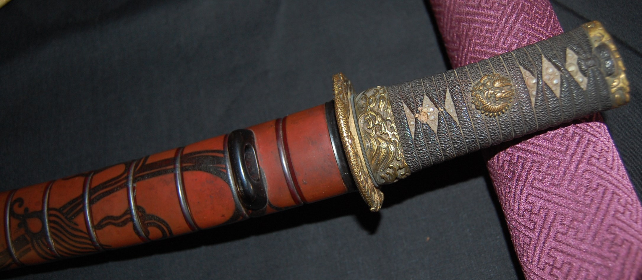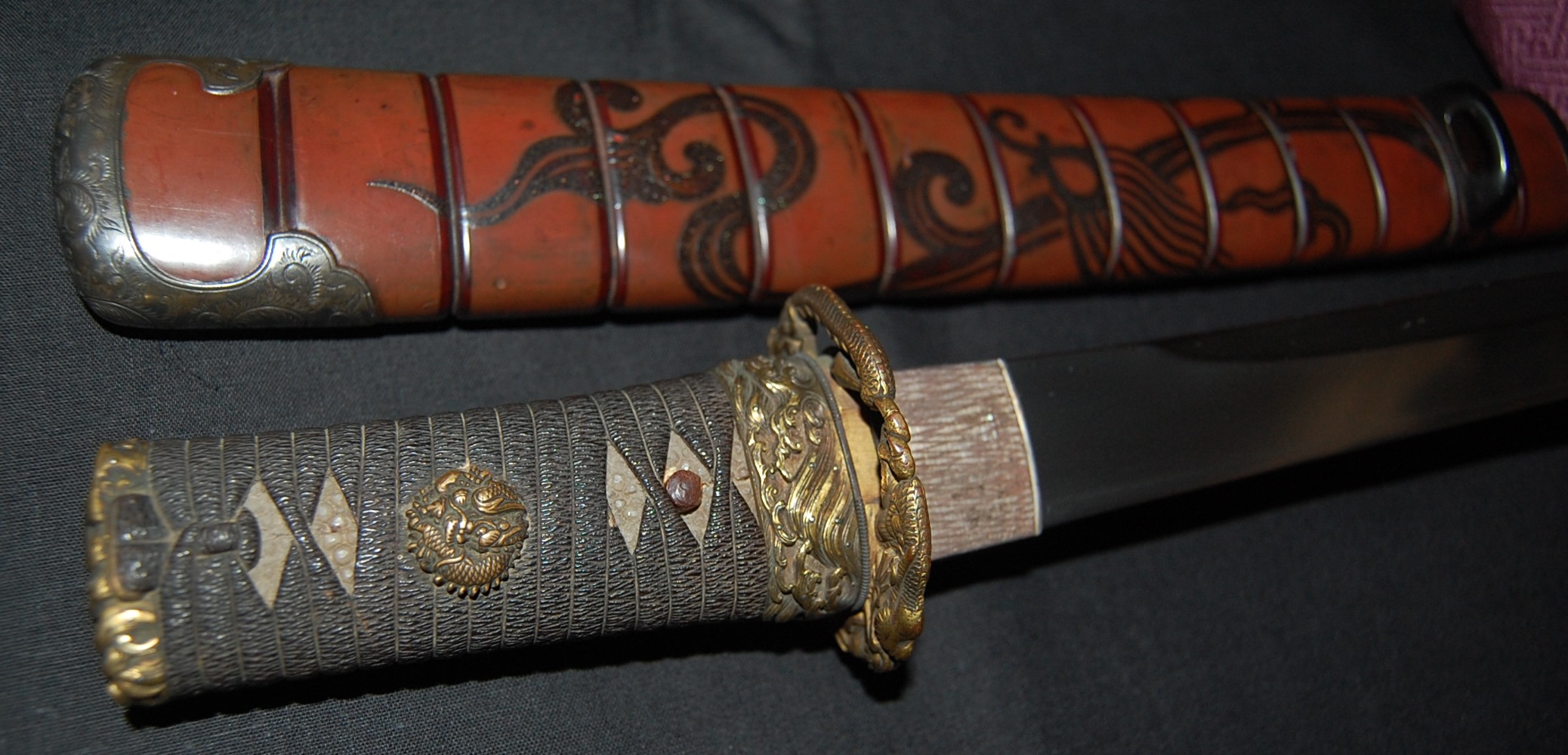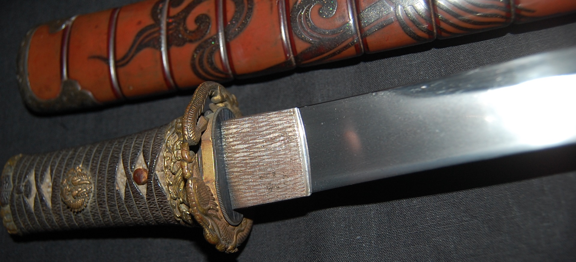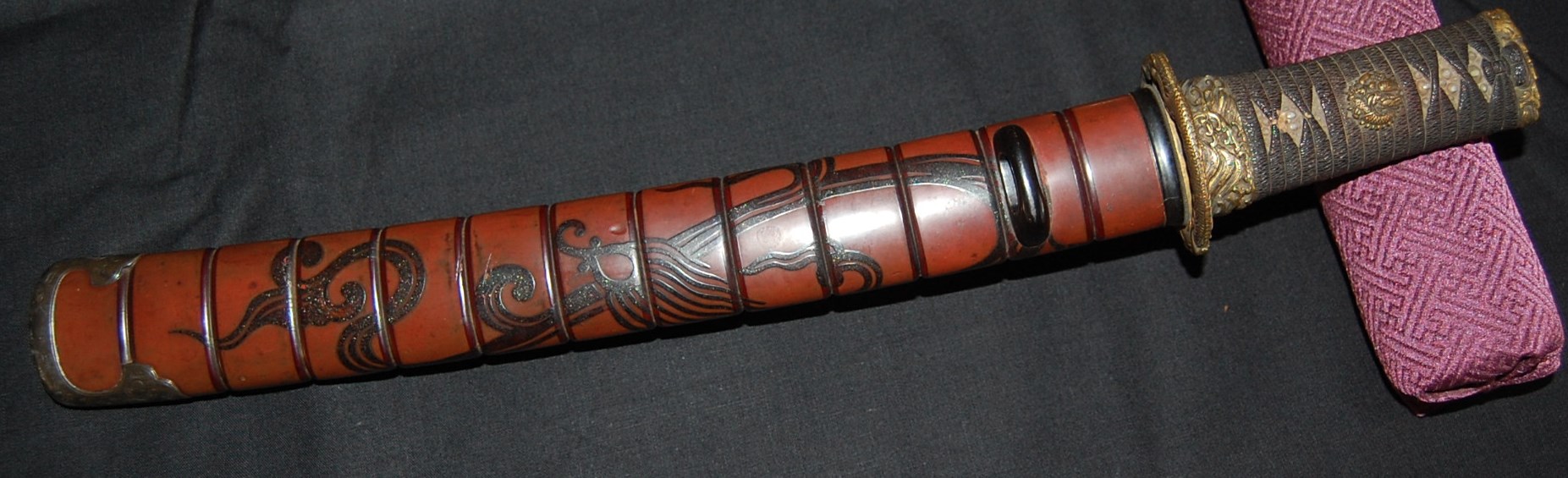 The blade has a tight Itame Hada and lovely fine Hamon, it is of Unokubi Zukuri construction. As well as the stunning blade, it has high quality specifically made mounts. All parts of the Koshirae are high quality: from the lovely red ribbed saya with water dragon, the beautifully wrapped Tsuka fitted with dragon menuki to the Ryo dragon Tsuba and Omori signed wave theme Fuchi/Kashira, this Tanto has it all, lots of high quality work to research.