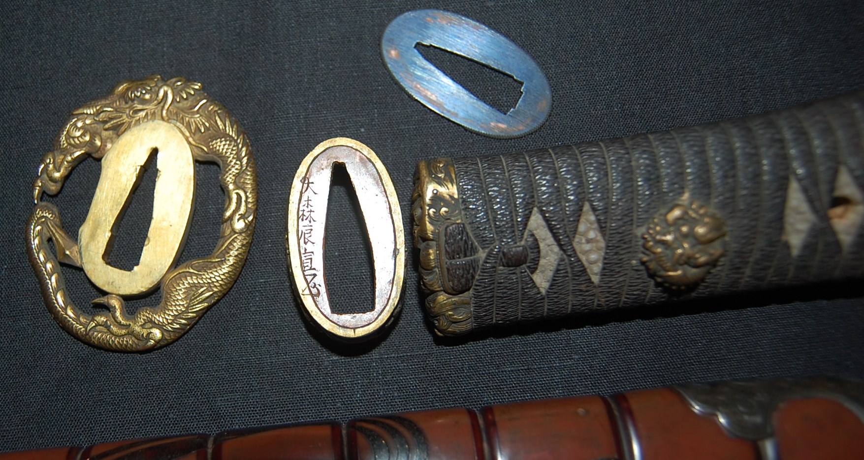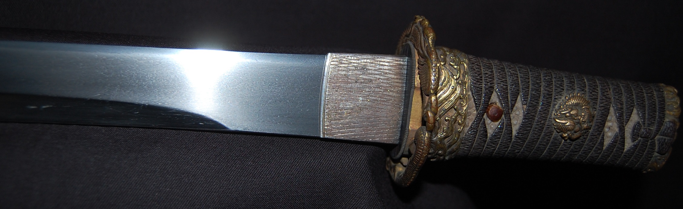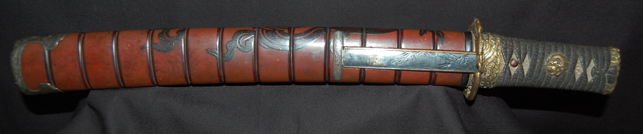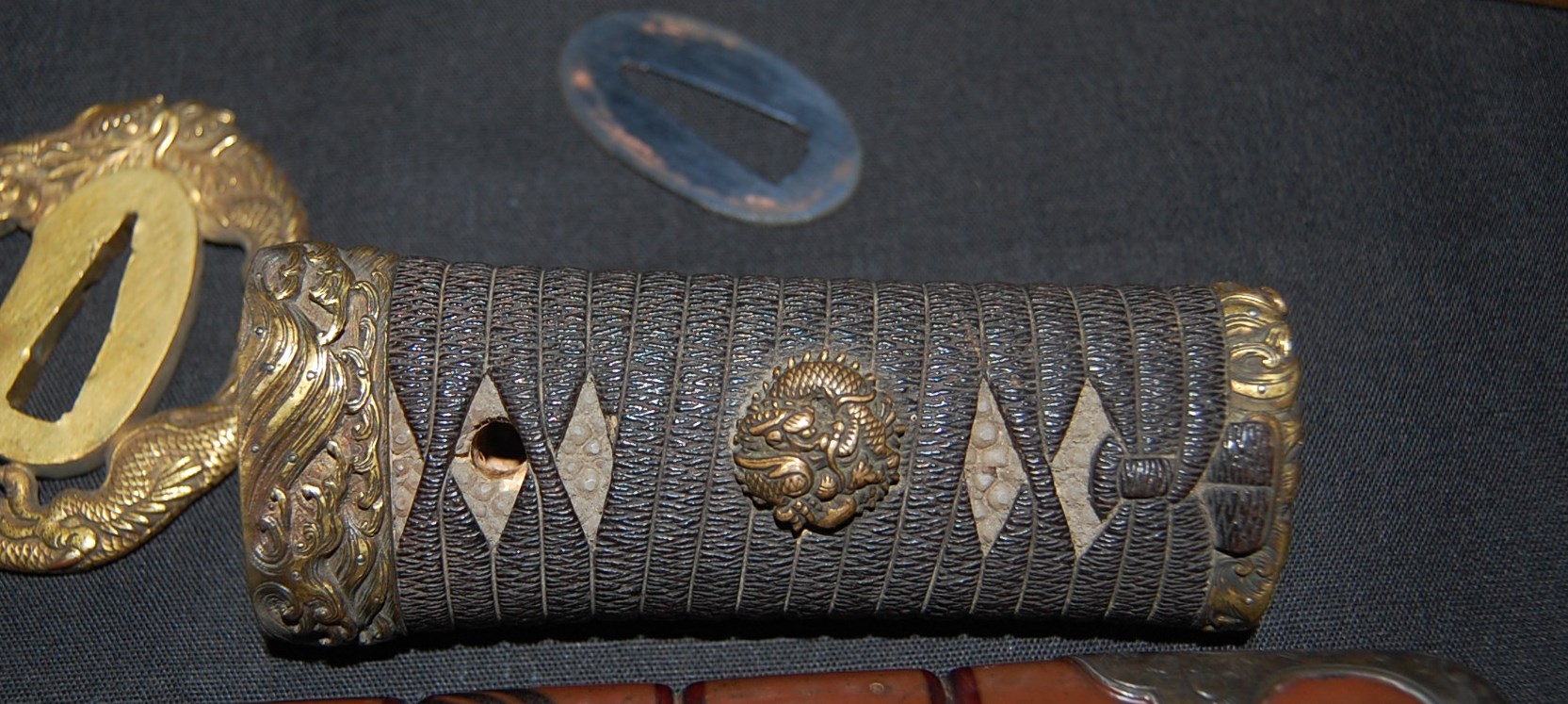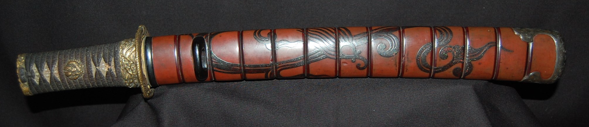 The blade has a tight Itame Hada and lovely fine Hamon, it is of Unokubi Zukuri construction. As well as the stunning blade, it has high quality specifically made mounts. All parts of the Koshirae are high quality: from the lovely red ribbed saya with water dragon, the beautifully wrapped Tsuka fitted with dragon menuki to the Ryo dragon Tsuba and Omori signed wave theme Fuchi/Kashira, this Tanto has it all, lots of high quality work to research.