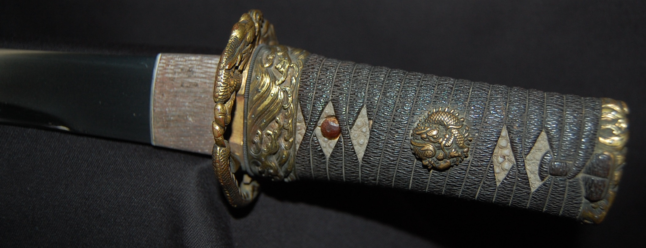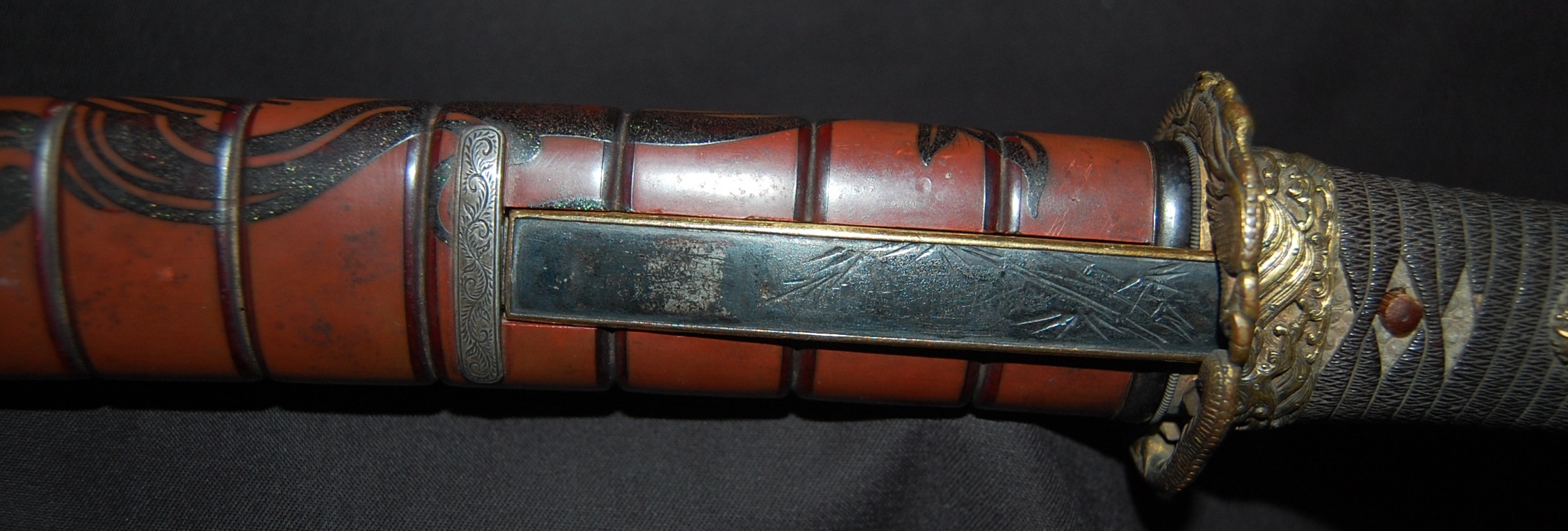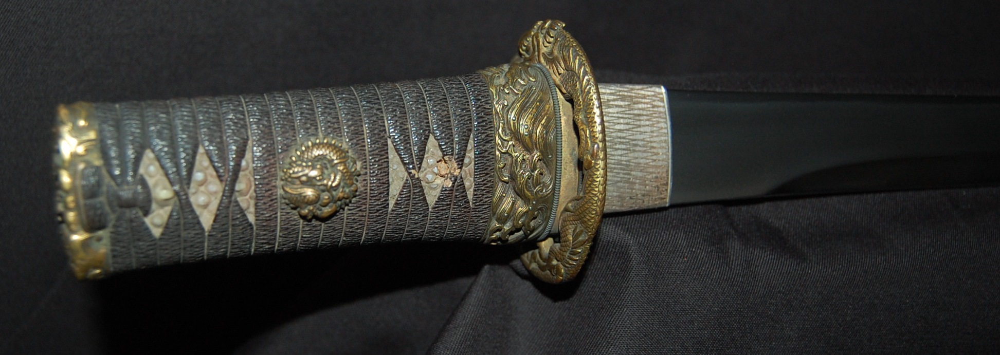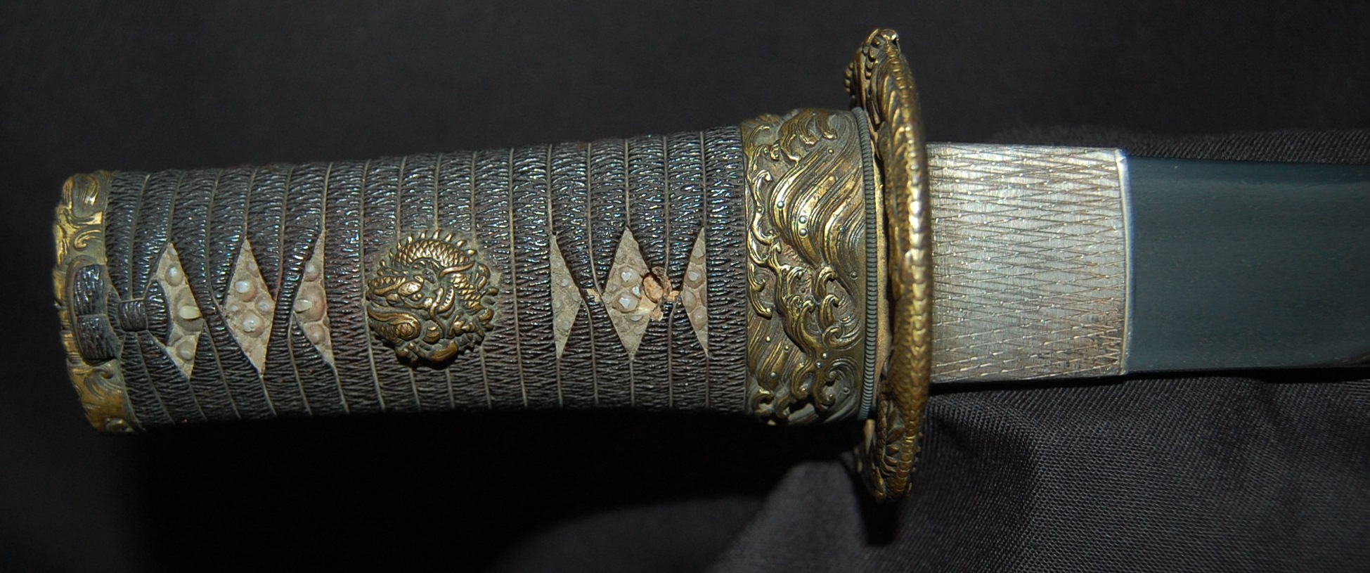 The blade has a tight Itame Hada and lovely fine Hamon, it is of Unokubi Zukuri construction. As well as the stunning blade, it has high quality specifically made mounts. All parts of the Koshirae are high quality: from the lovely red ribbed saya with water dragon, the beautifully wrapped Tsuka fitted with dragon menuki to the Ryo dragon Tsuba and Omori signed wave theme Fuchi/Kashira, this Tanto has it all, lots of high quality work to research.