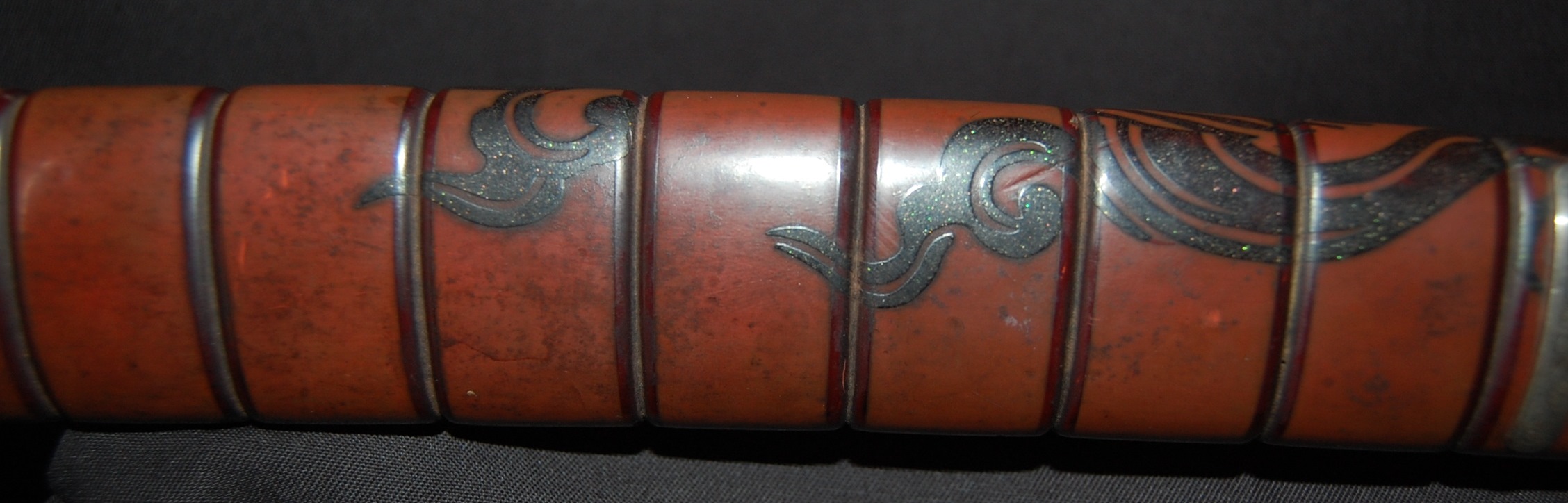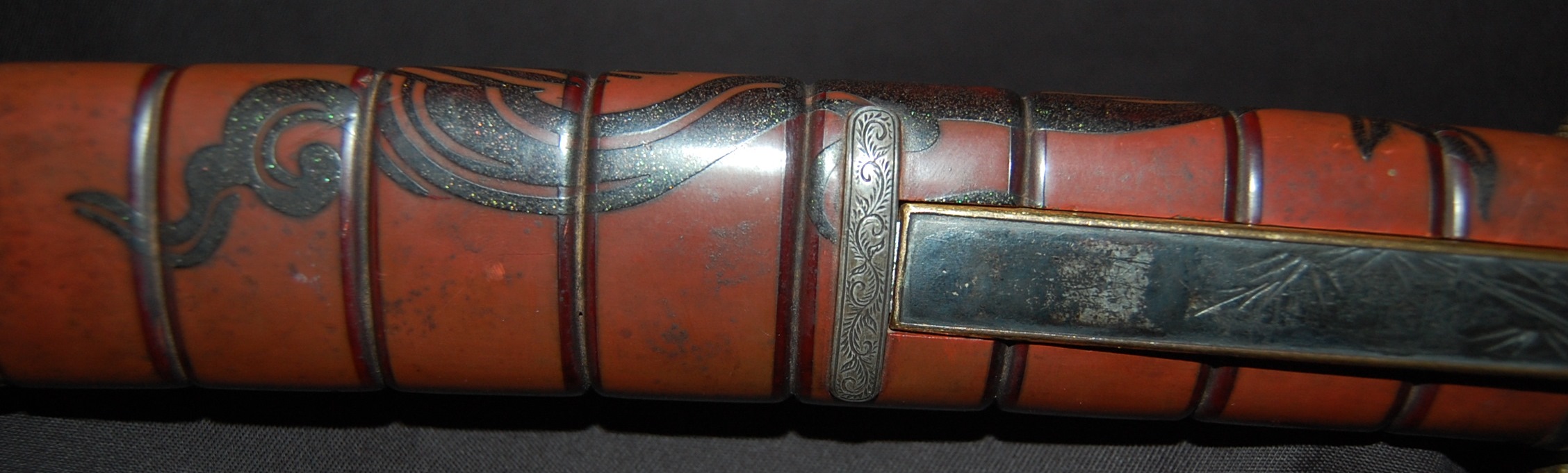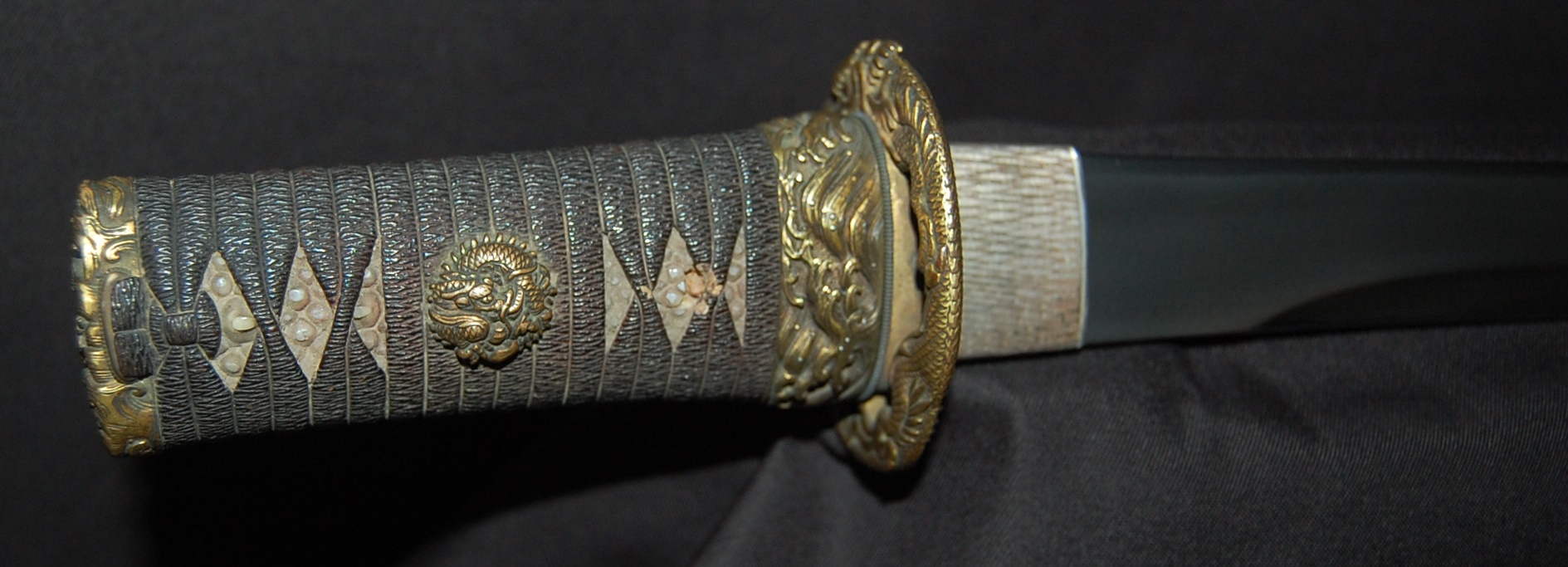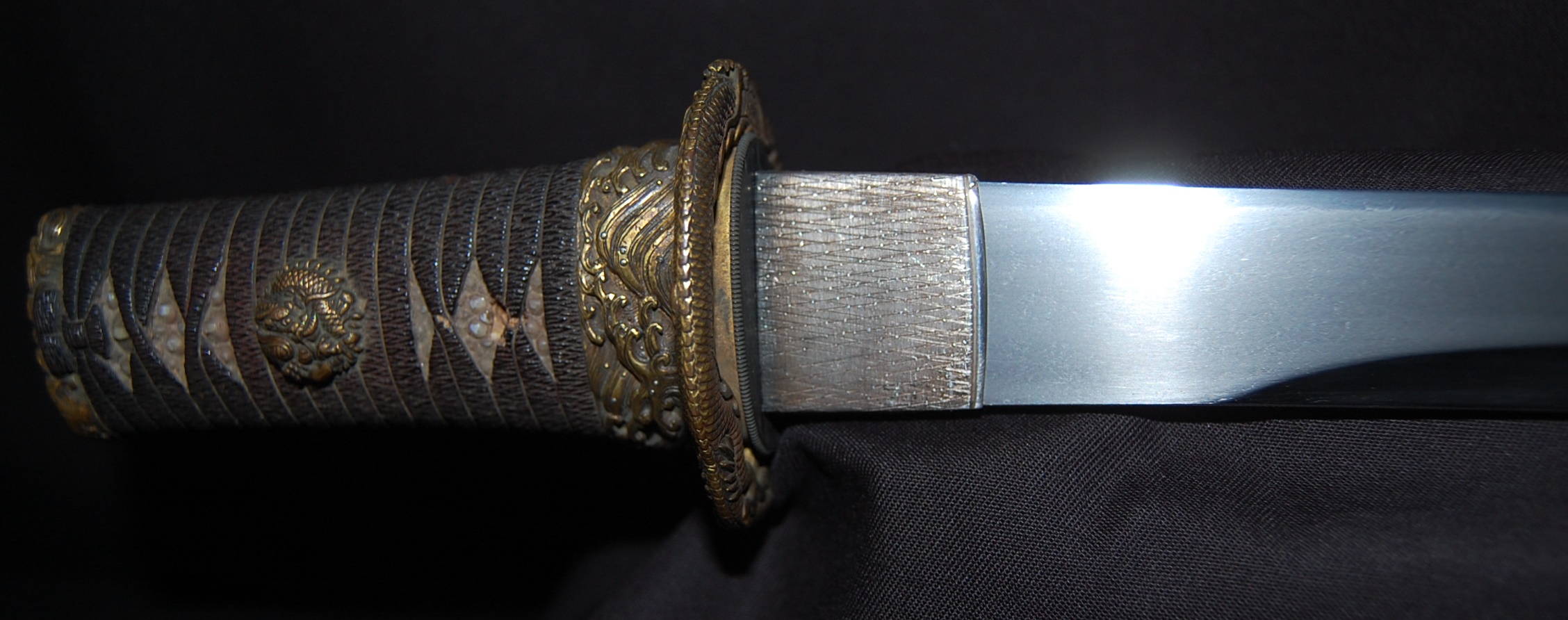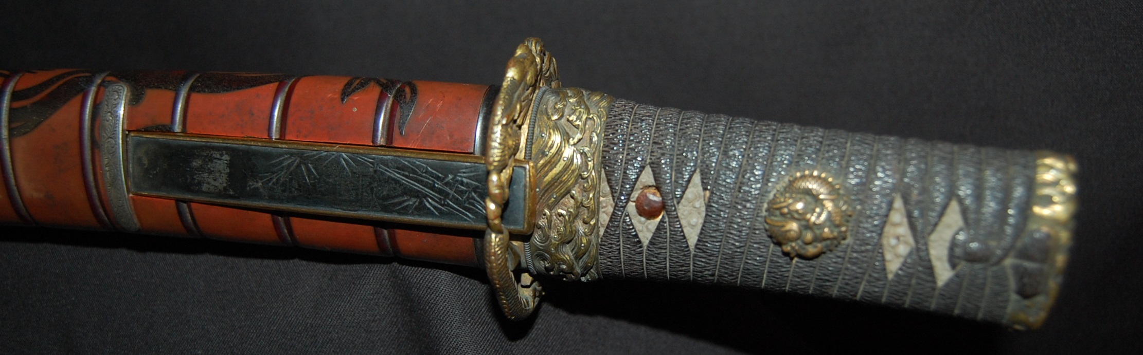 The blade has a tight Itame Hada and lovely fine Hamon, it is of Unokubi Zukuri construction. As well as the stunning blade, it has high quality specifically made mounts. All parts of the Koshirae are high quality: from the lovely red ribbed saya with water dragon, the beautifully wrapped Tsuka fitted with dragon menuki to the Ryo dragon Tsuba and Omori signed wave theme Fuchi/Kashira, this Tanto has it all, lots of high quality work to research.
