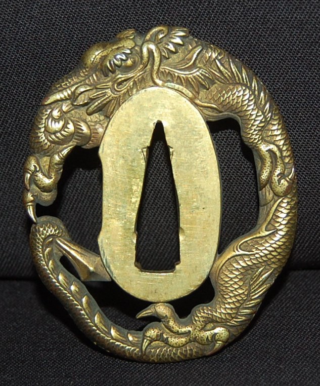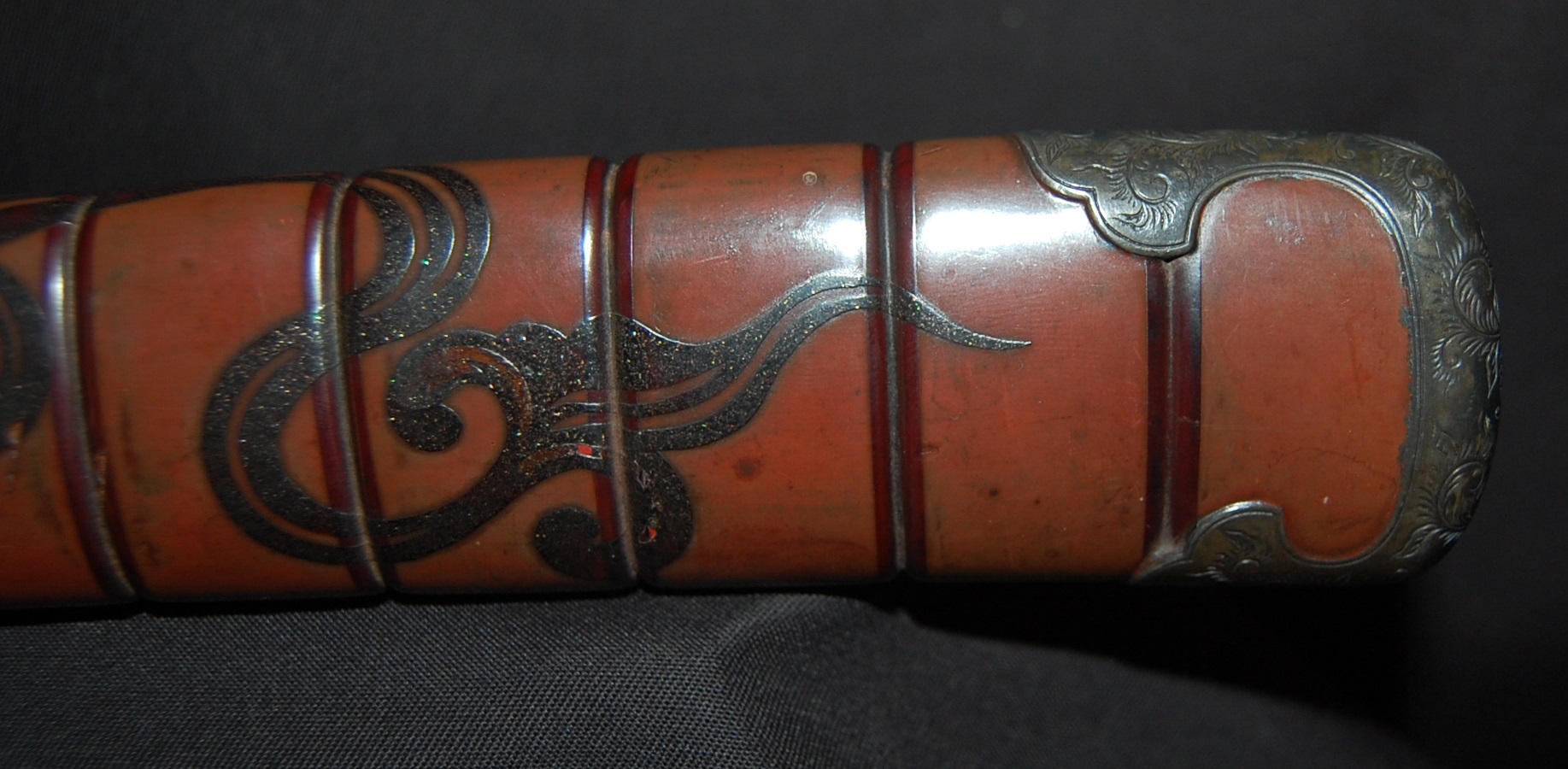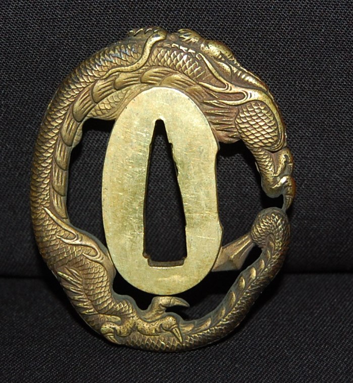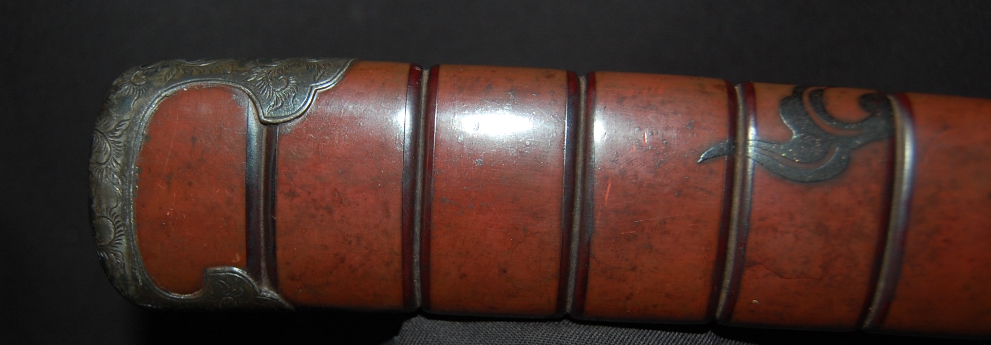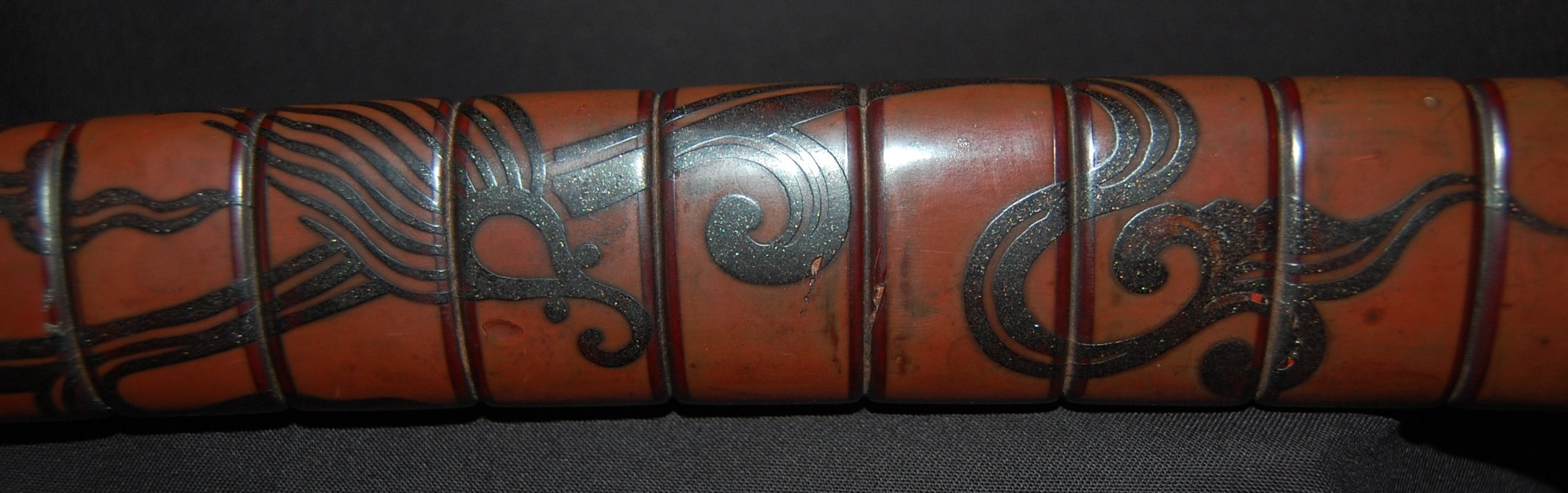 The blade has a tight Itame Hada and lovely fine Hamon, it is of Unokubi Zukuri construction. As well as the stunning blade, it has high quality specifically made mounts. All parts of the Koshirae are high quality: from the lovely red ribbed saya with water dragon, the beautifully wrapped Tsuka fitted with dragon menuki to the Ryo dragon Tsuba and Omori signed wave theme Fuchi/Kashira, this Tanto has it all, lots of high quality work to research.