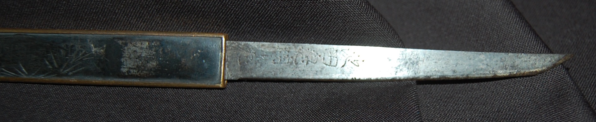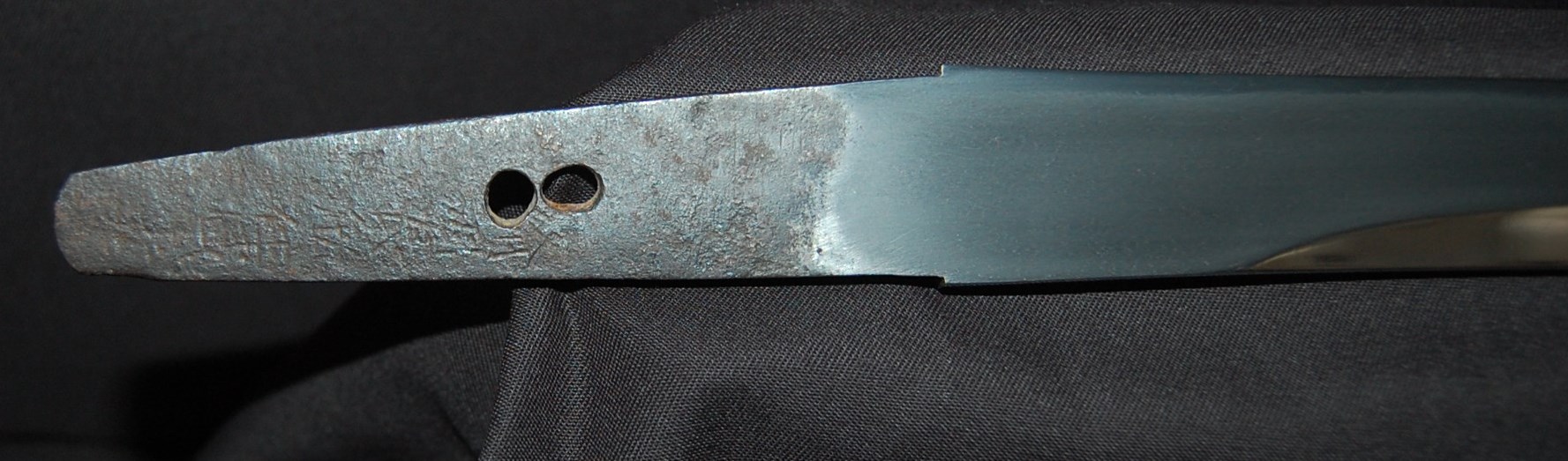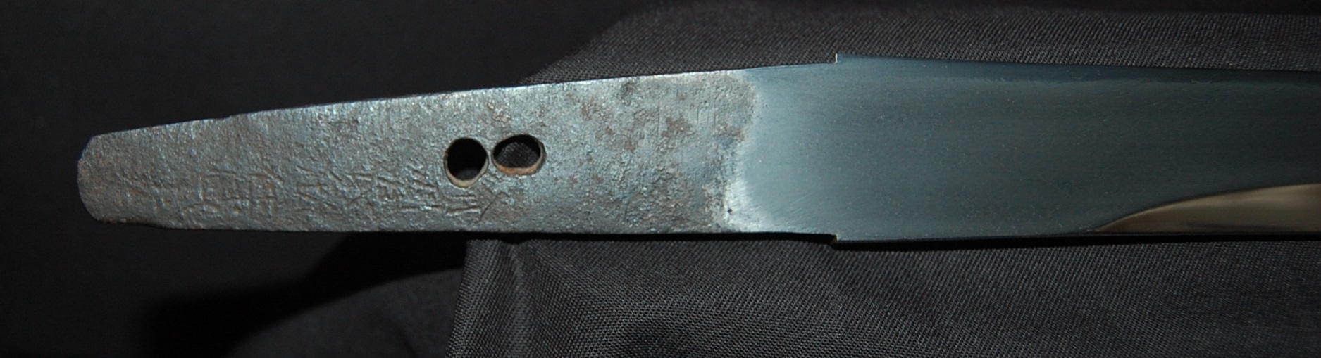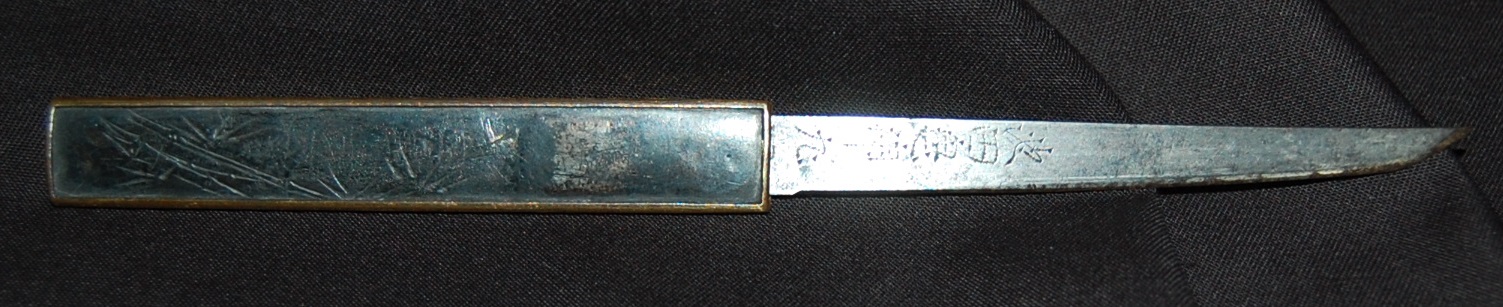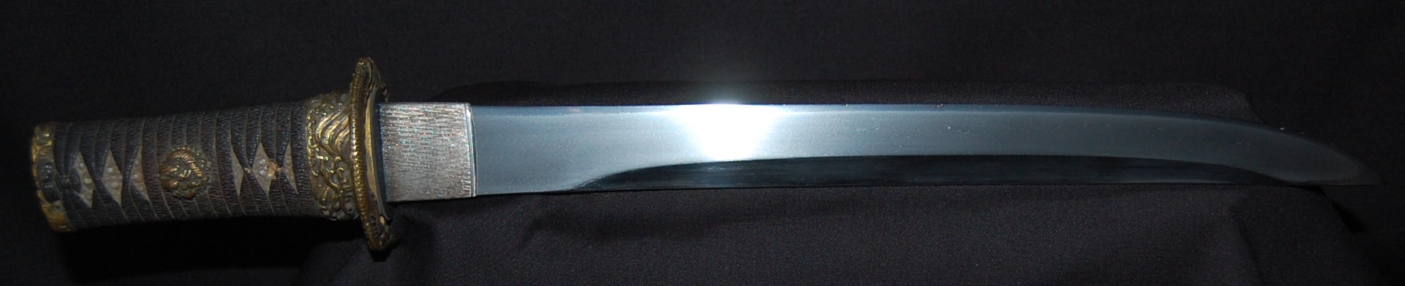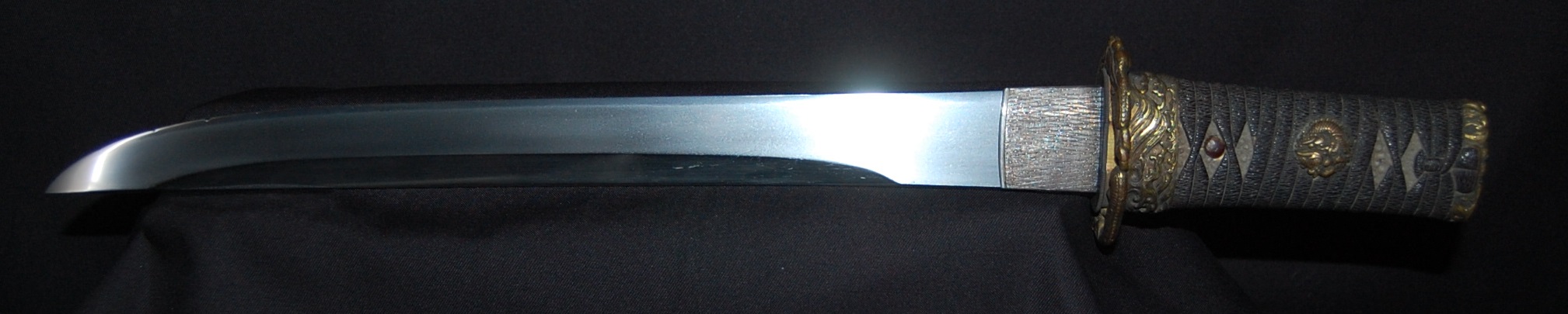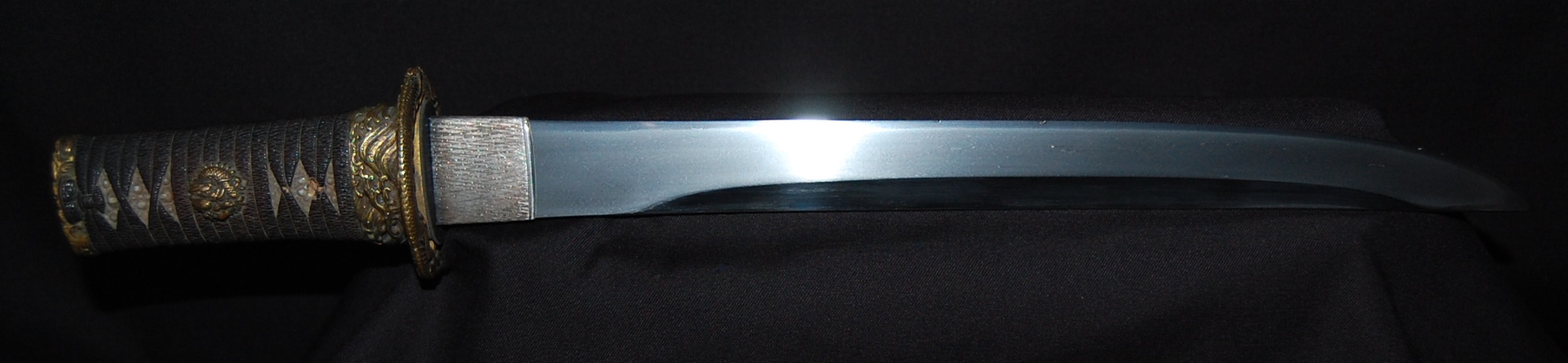This Tanto is signed Bizen Osafune something Mitsu, maybe Yasumitsu, needs confirming.  The Fuchi is signed Omori Tatsunobu, the kugitana signed Ikeda Kishinmaru Kunishige.