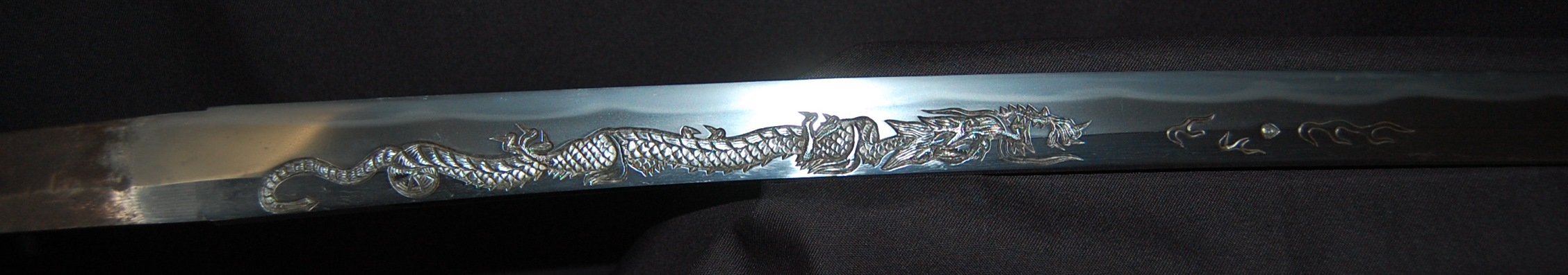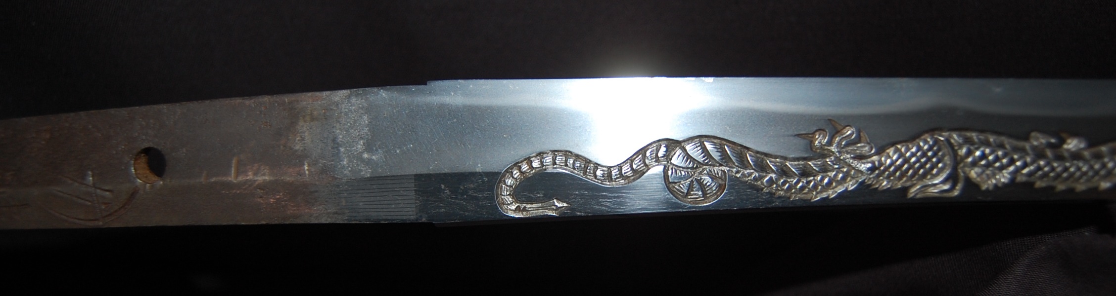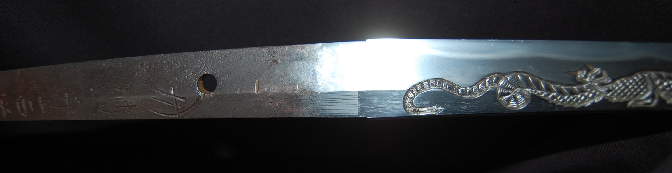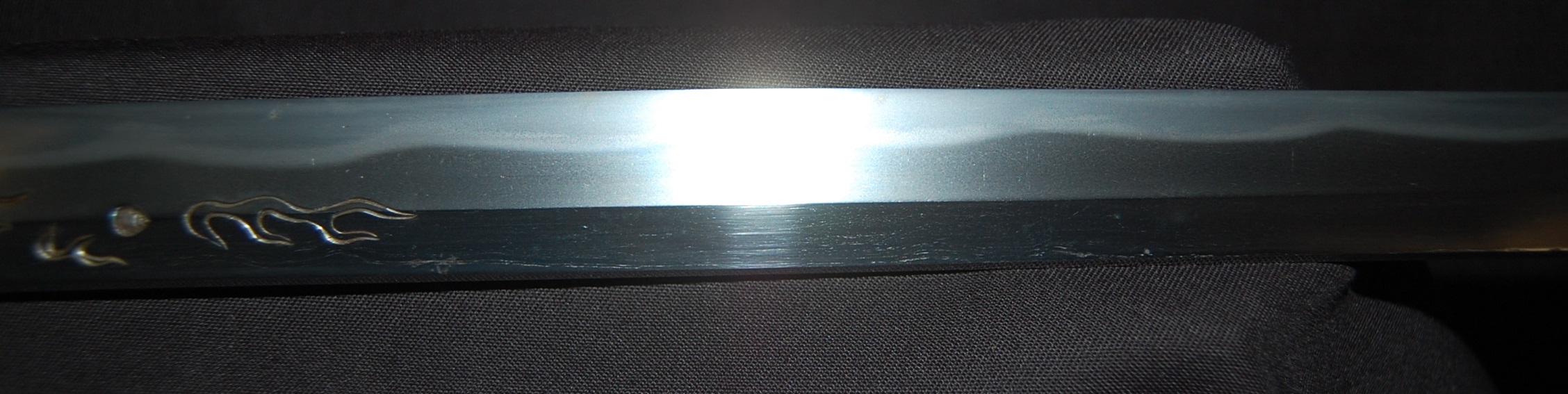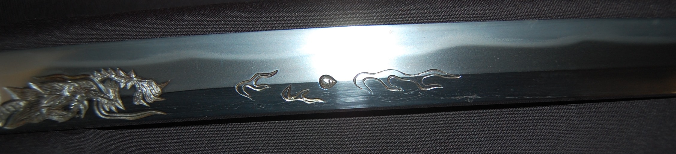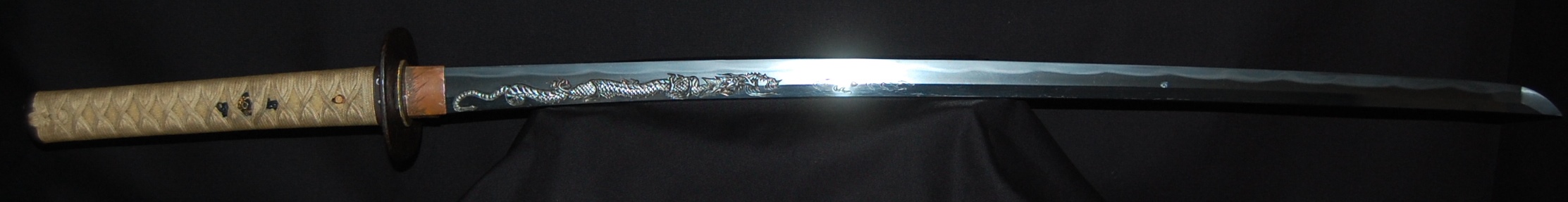 This katana has a tight Ko-Itame hada and a Hamon that is beautiful and constant throughout, it has a prominent Boshi with Sunagashi and other activities to enjoy. As well as the enjoyable Hada and Hamon, the blade has Horimono engravings on both sides: On the Omote side, it has the iconic Tama-oi-Ryu motif which shows a Ryu dragon chasing Hoju orbs. On the Ura side, it has a rather long Bonji Sankrit, the translation currently unknown but both Horimono are very well done.