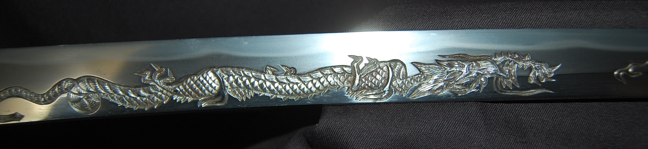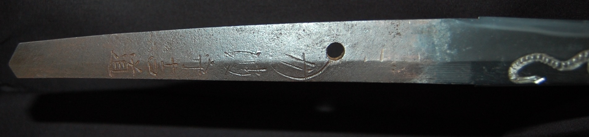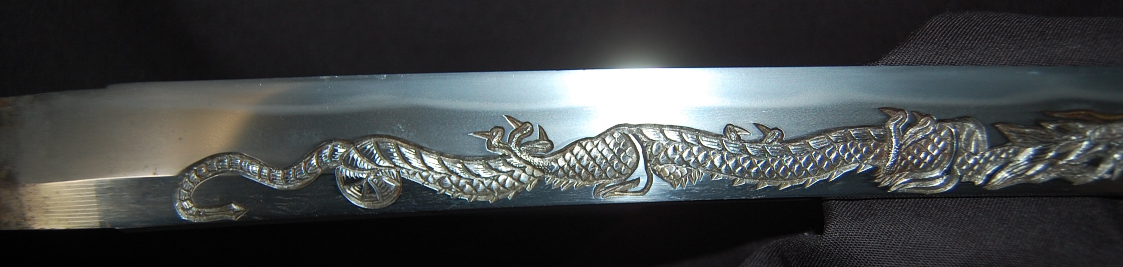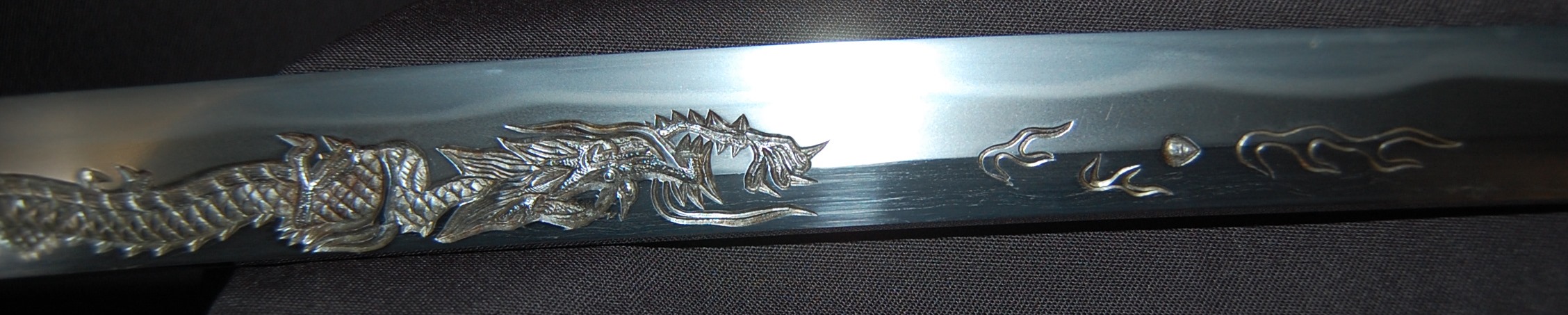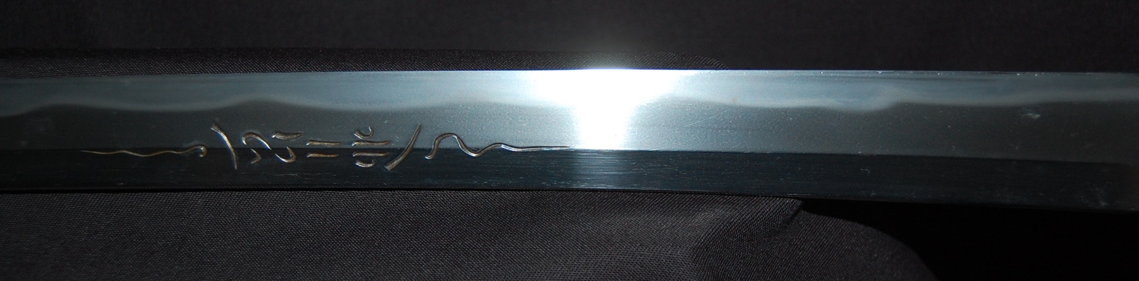 This katana has a tight Ko-Itame hada and a Hamon that is beautiful and constant throughout, it has a prominent Boshi with Sunagashi and other activities to enjoy. As well as the enjoyable Hada and Hamon, the blade has Horimono engravings on both sides: On the Omote side, it has the iconic Tama-oi-Ryu motif which shows a Ryu dragon chasing Hoju orbs. On the Ura side, it has a rather long Bonji Sankrit, the translation currently unknown but both Horimono are very well done.