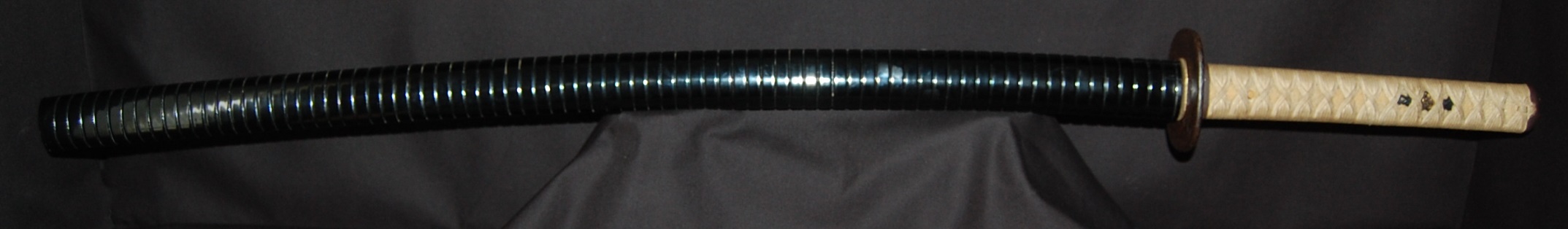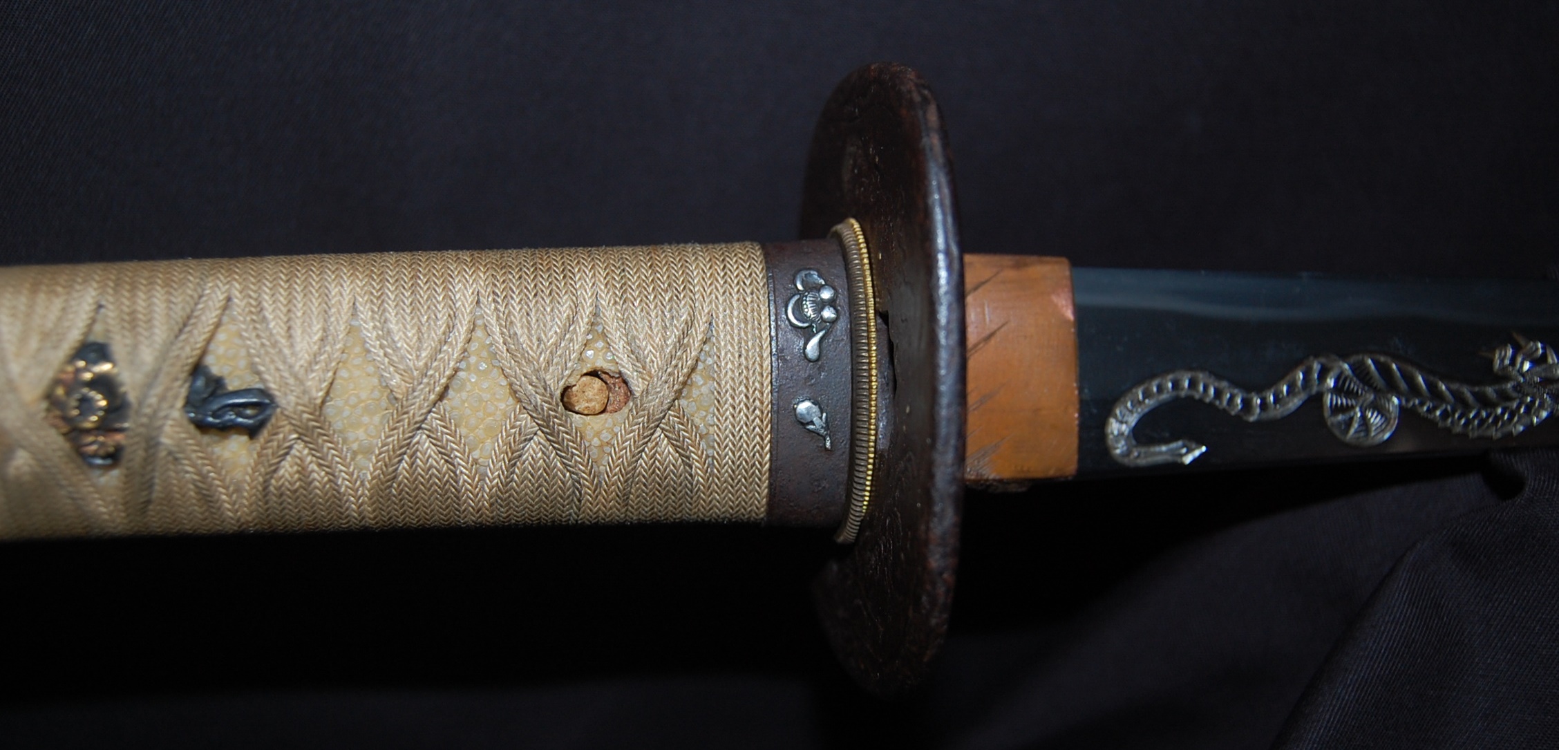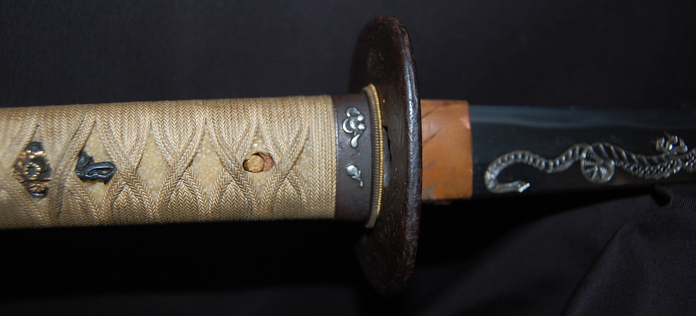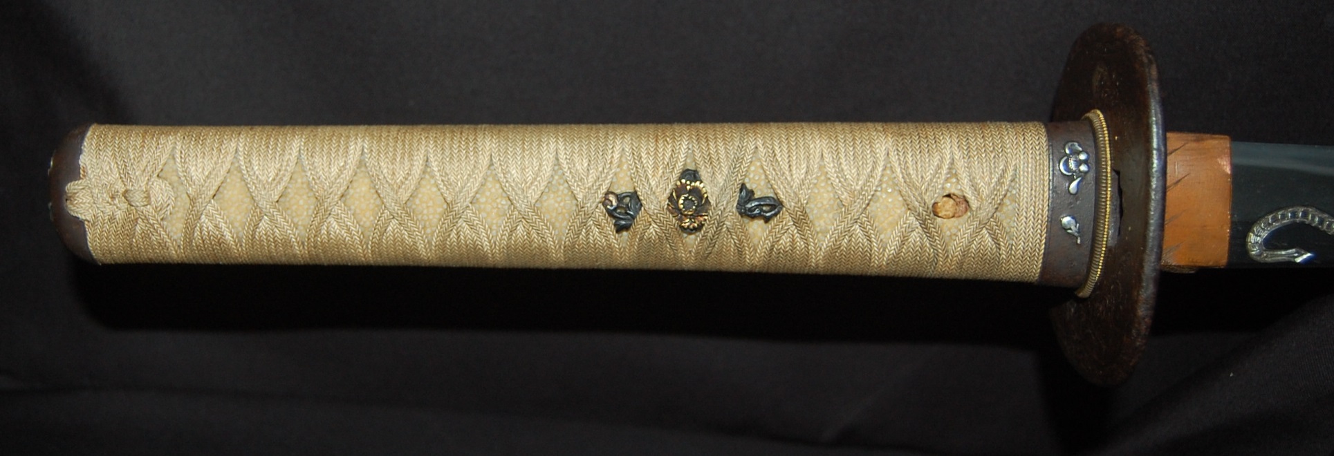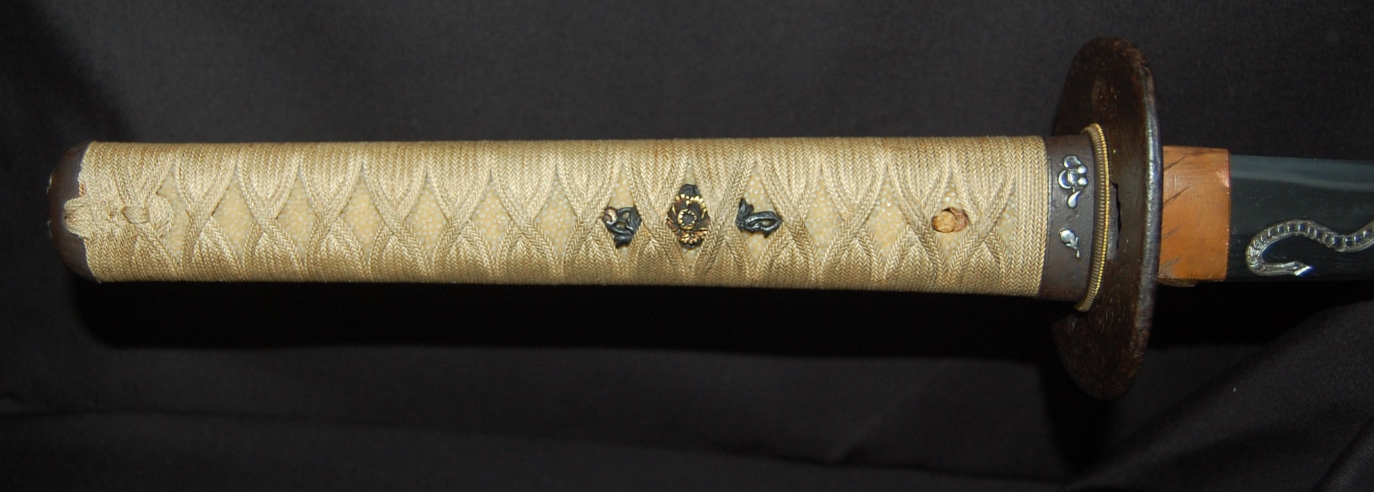 The Koshirae is also very enjoyable. The iron Tsuba, in a classic Nami ni Usagi motif, which originated from the ancient poem Chikubu-shima, depicting a rabbit dancing on the waves under the moon, is excellently forged and engraved. The Tsuka, wrapped in a gorgeous and complicated Jabara-maki style Tsukamaki, mounted with iron Fuchikashira with silver Ume flower engraving, is a very neat and clean set. The black lacquer Saya is engraved and applied with a variation style Inro-nuri style design.