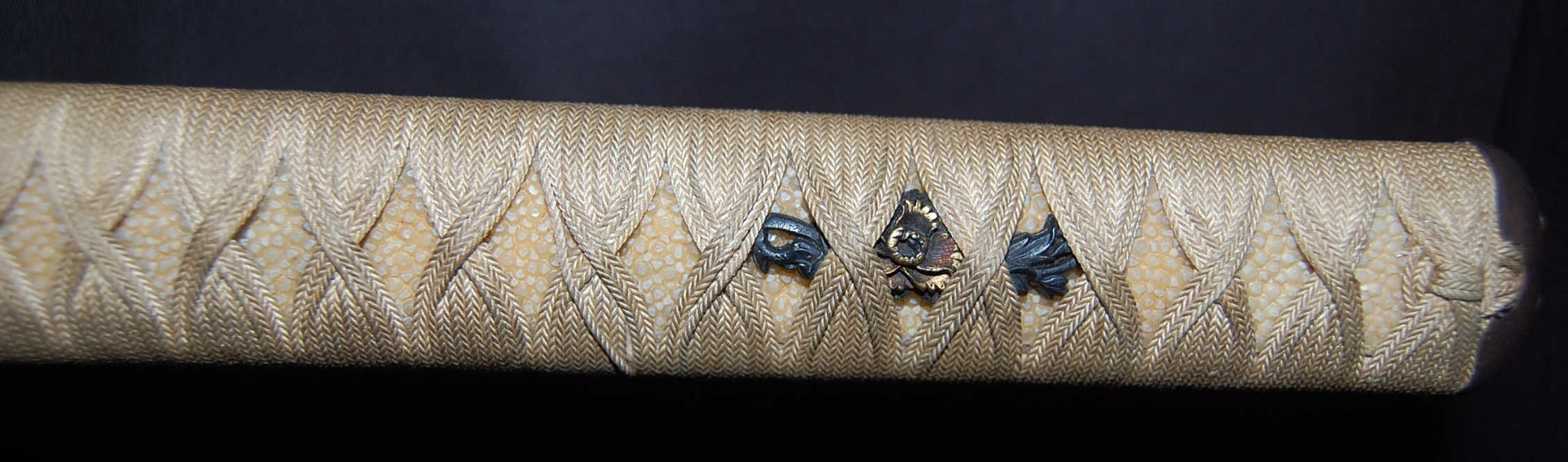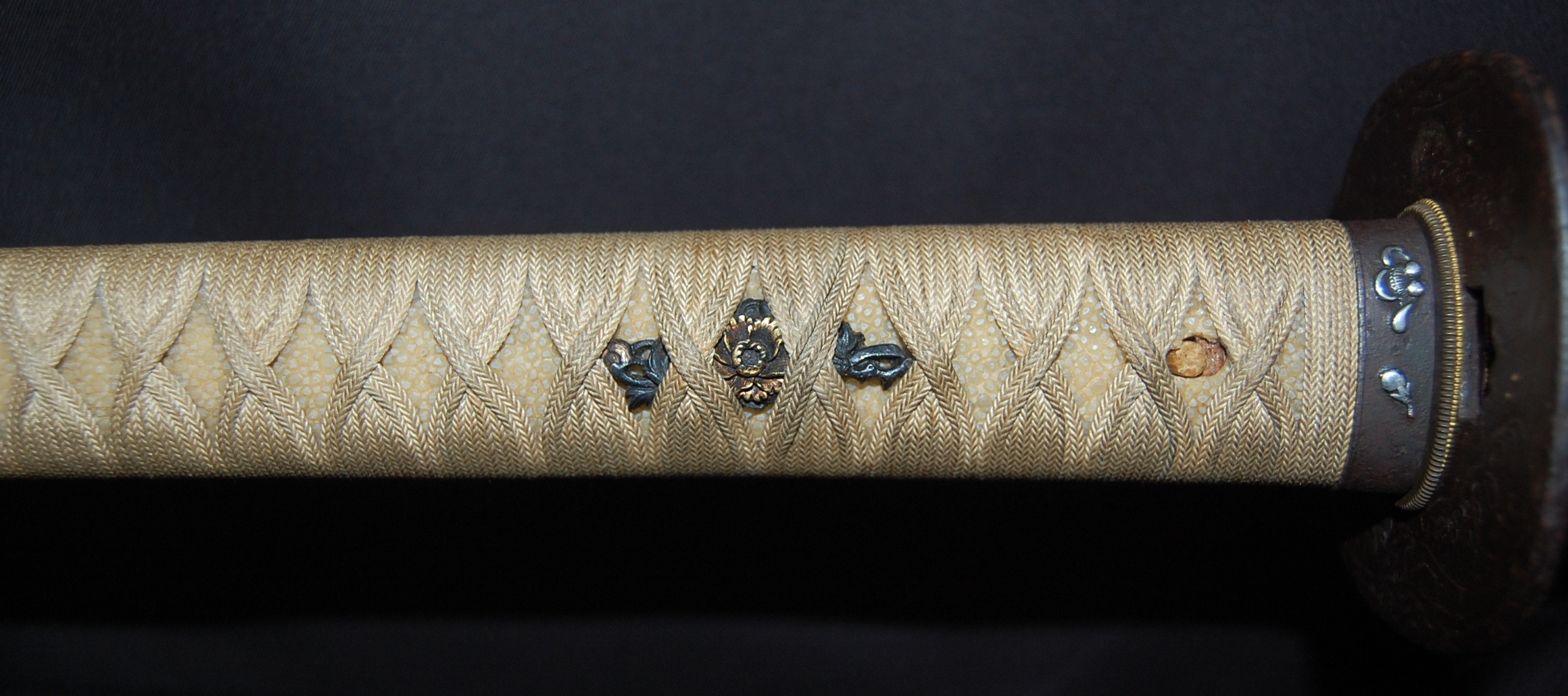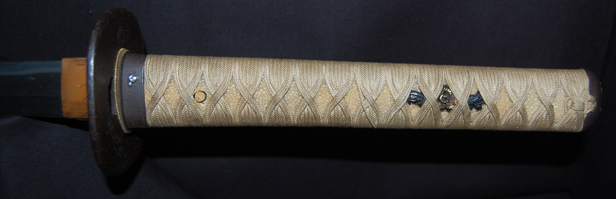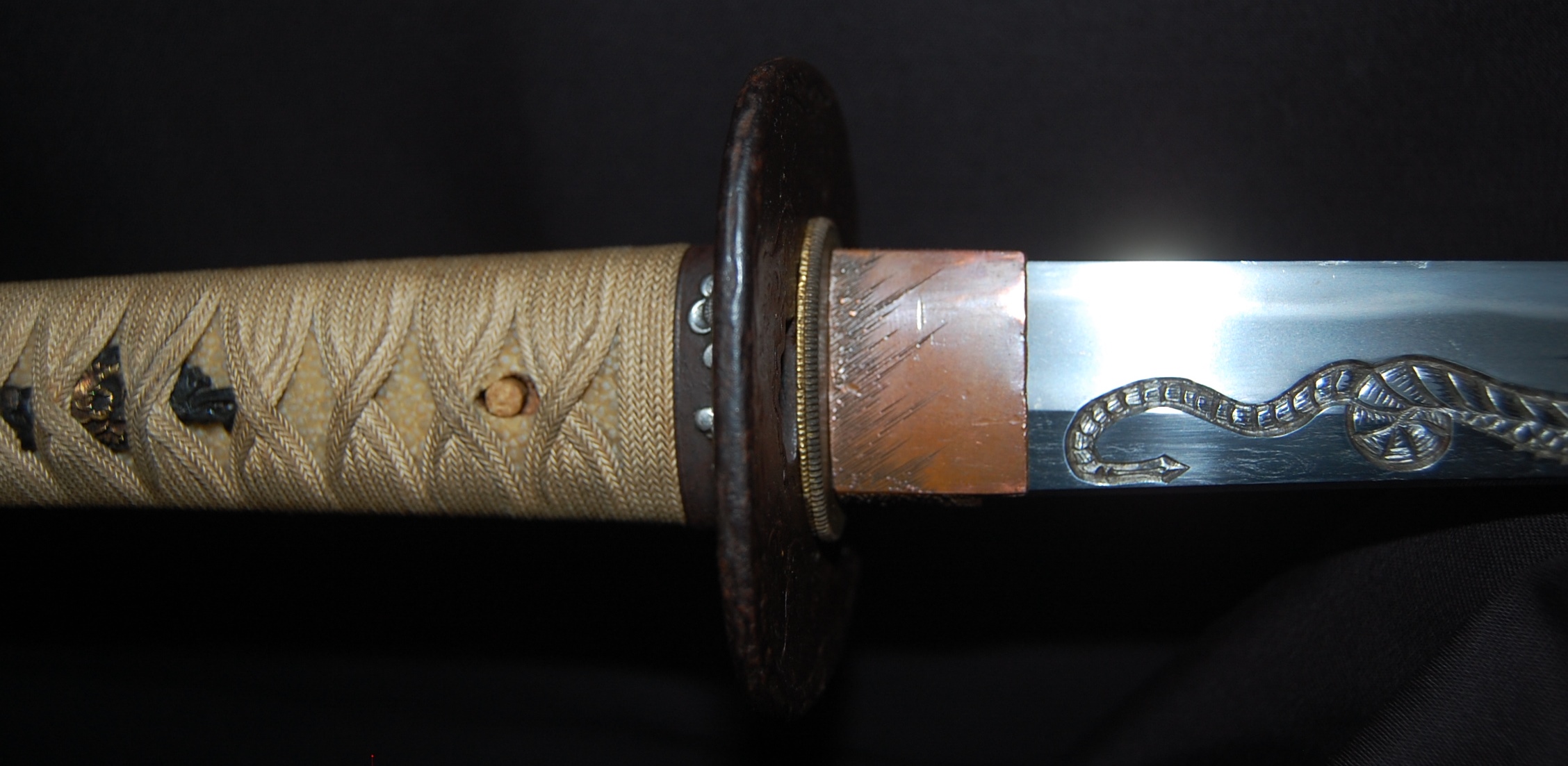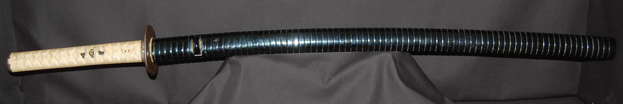 The Koshirae is also very enjoyable. The iron Tsuba, in a classic Nami ni Usagi motif, which originated from the ancient poem Chikubu-shima, depicting a rabbit dancing on the waves under the moon, is excellently forged and engraved. The Tsuka, wrapped in a gorgeous and complicated Jabara-maki style Tsukamaki, mounted with iron Fuchikashira with silver Ume flower engraving, is a very neat and clean set. The black lacquer Saya is engraved and applied with a variation style Inro-nuri style design.
