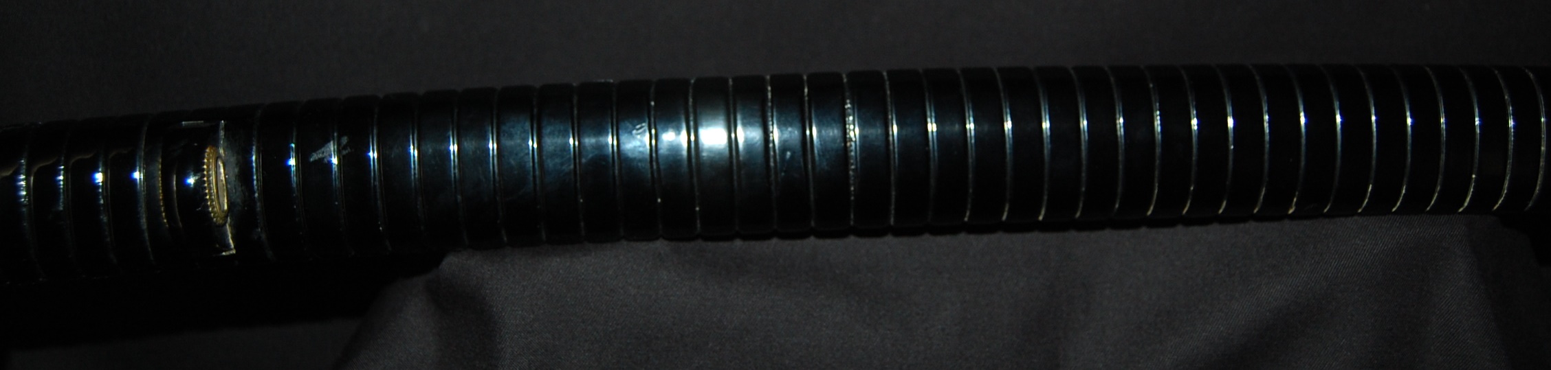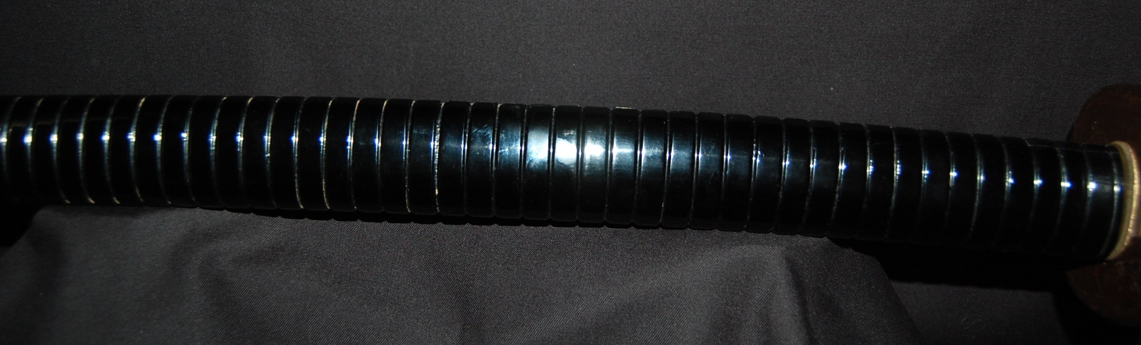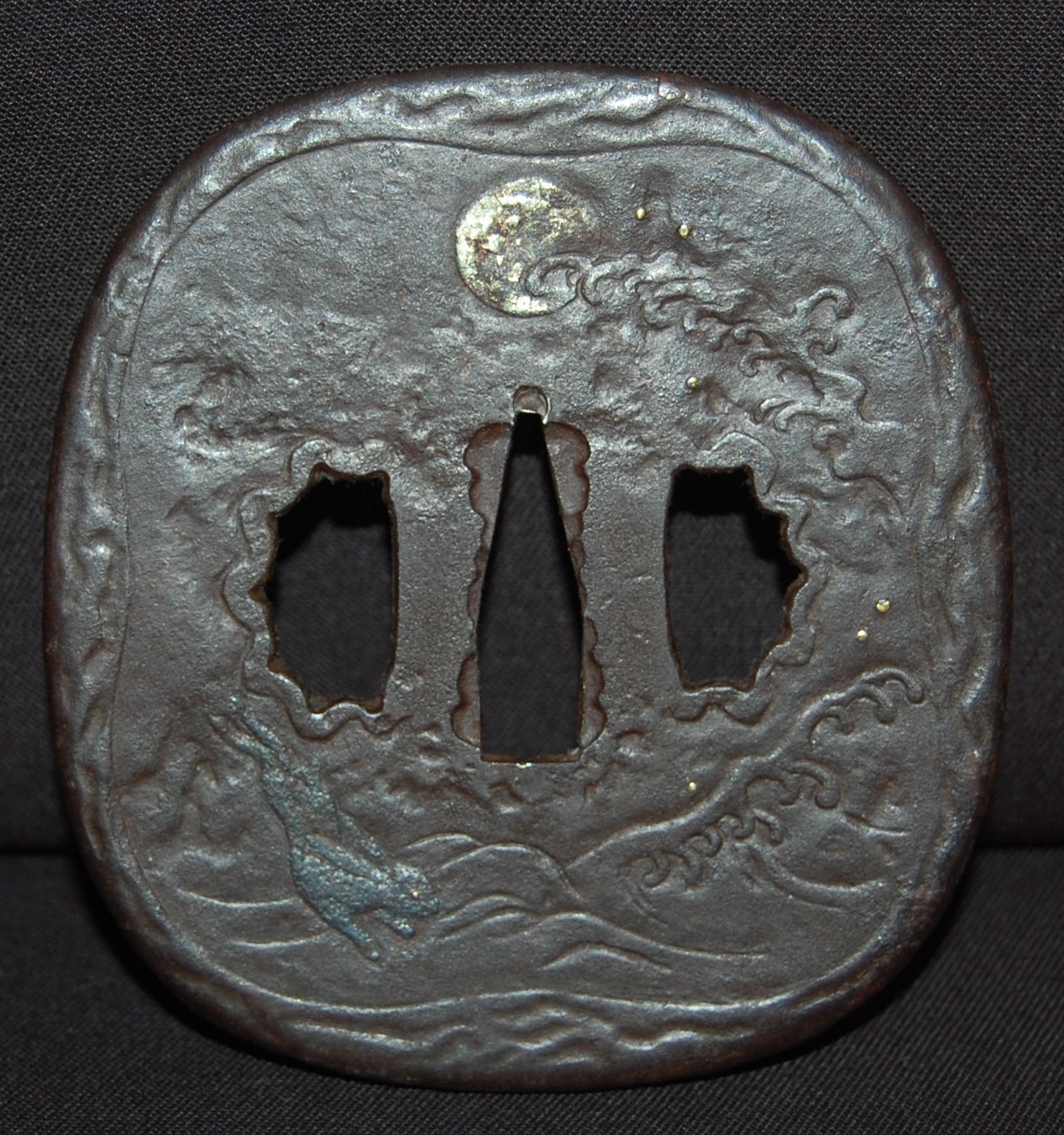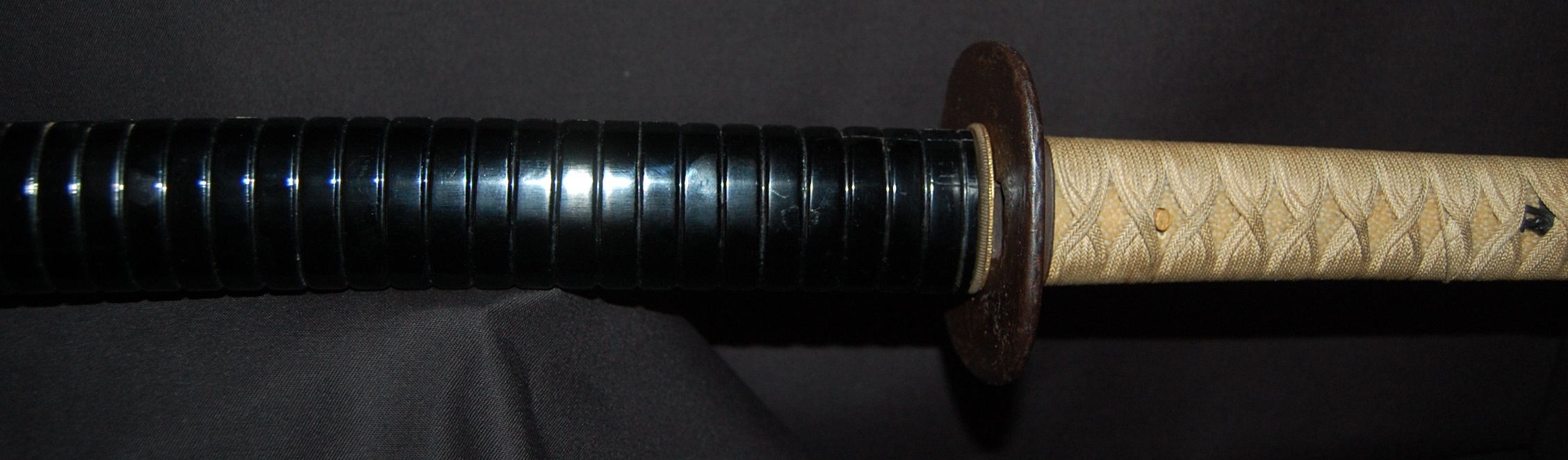 The Koshirae is also very enjoyable. The iron Tsuba, in a classic Nami ni Usagi motif, which originated from the ancient poem Chikubu-shima, depicting a rabbit dancing on the waves under the moon, is excellently forged and engraved. The Tsuka, wrapped in a gorgeous and complicated Jabara-maki style Tsukamaki, mounted with iron Fuchikashira with silver Ume flower engraving, is a very neat and clean set. The black lacquer Saya is engraved and applied with a variation style Inro-nuri style design.