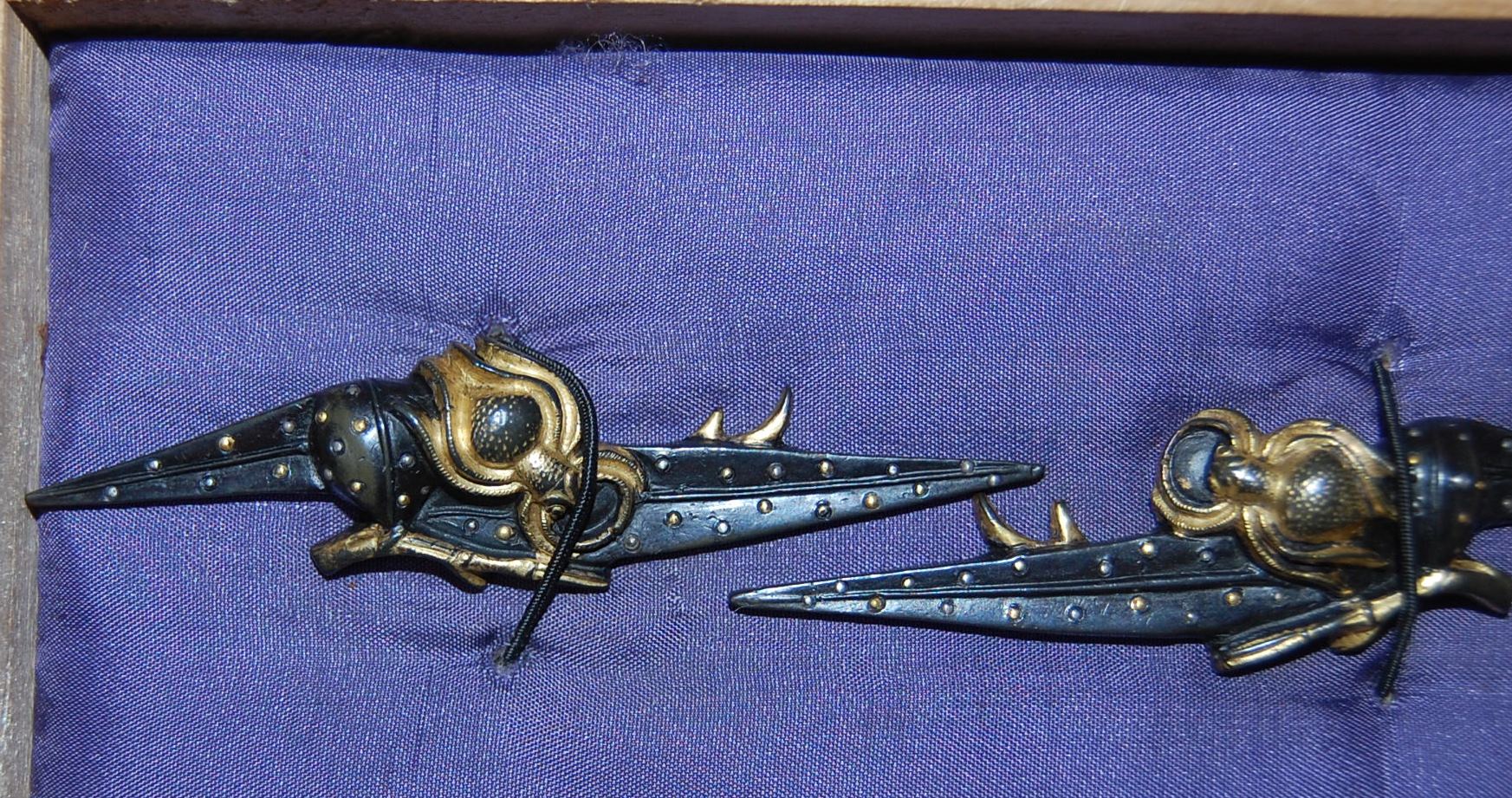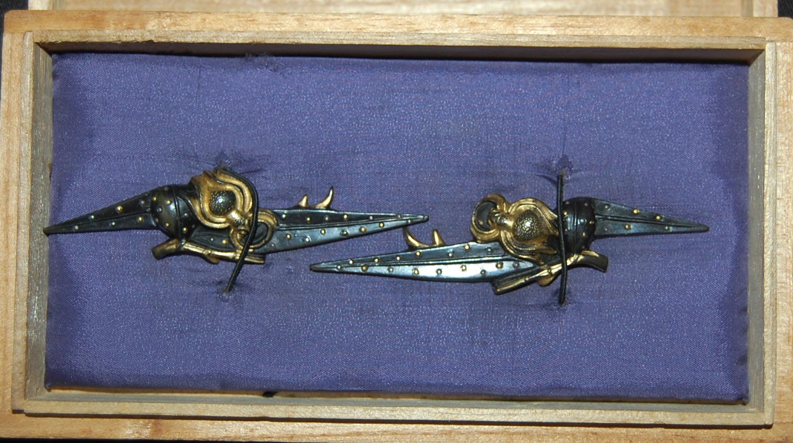 A large set of Menuki depicting an Orb spider and a ladybird on Iris leaves.